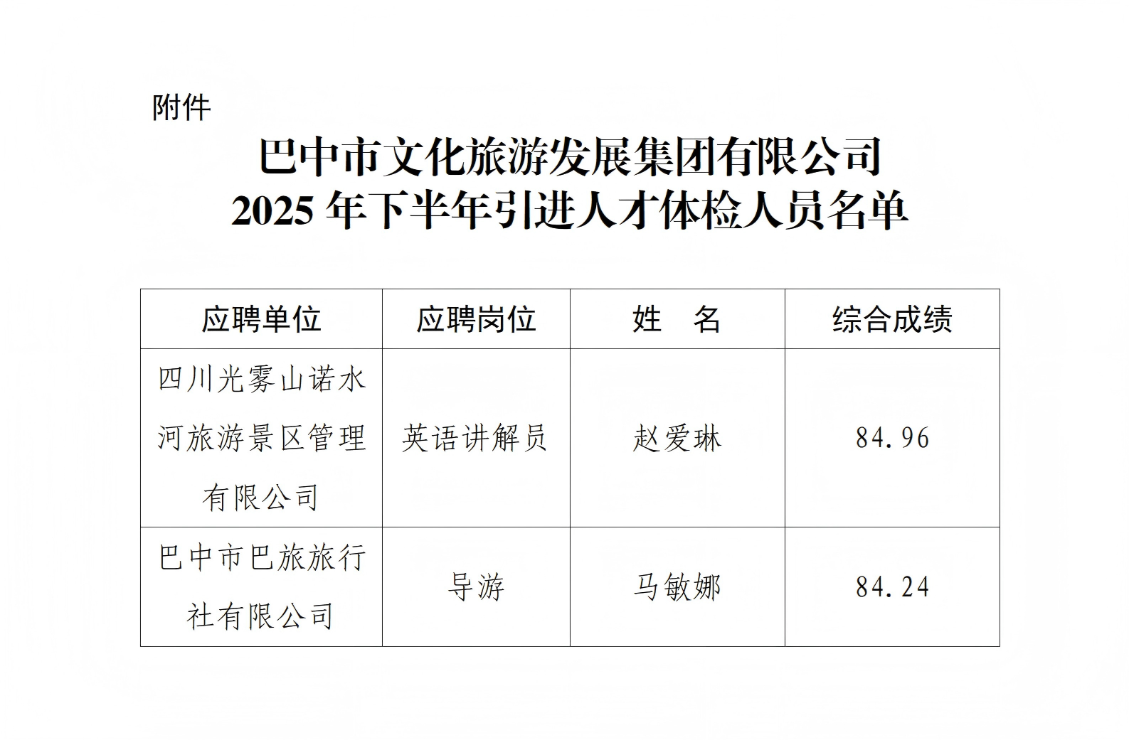 根據(jù)市委組織部《四川省巴中市2025年下半年引進高層次人才和急需緊缺專業(yè)人才公告》和《巴中市文化旅游發(fā)展集團有限公司關(guān)于2025年下半年引進人才資格審查合格人員名單及面試安排的公告》精神,現(xiàn)將引進人才進入體檢及考察相關(guān)事宜公告如下。